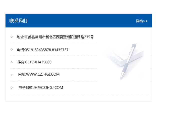地址:常州市新北區友邦商務大廈1幢16、17層  電話:0519-85101652  傳真:0519-85112595  郵編:213022  網址:www.cz-jiayue_cn.fhdian.com  郵箱:xiajifengaa@163.com